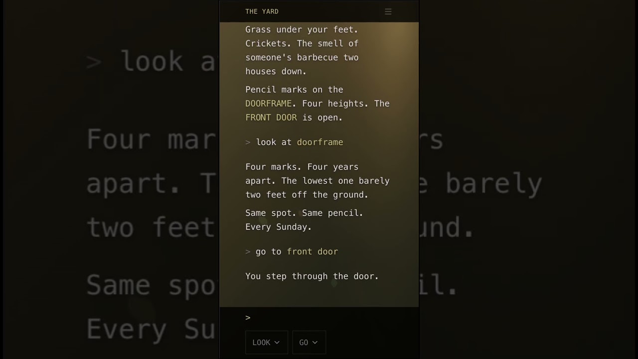 This clip starts in a yard. Crickets. Barbecue smoke. Pencil marks on a doorframe. It feels like home.